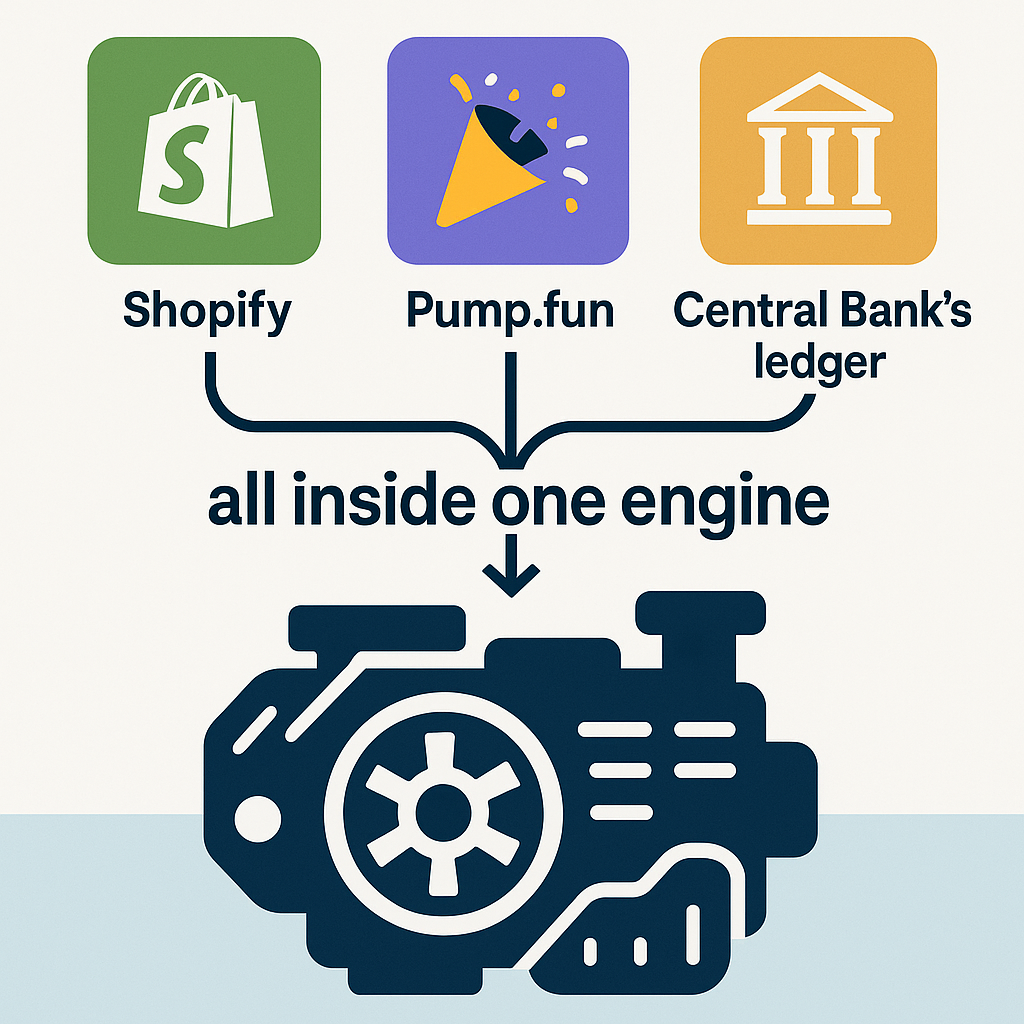 Think Shopify, Pump.Fun, and a Central Bank’s ledger… all inside one engine.